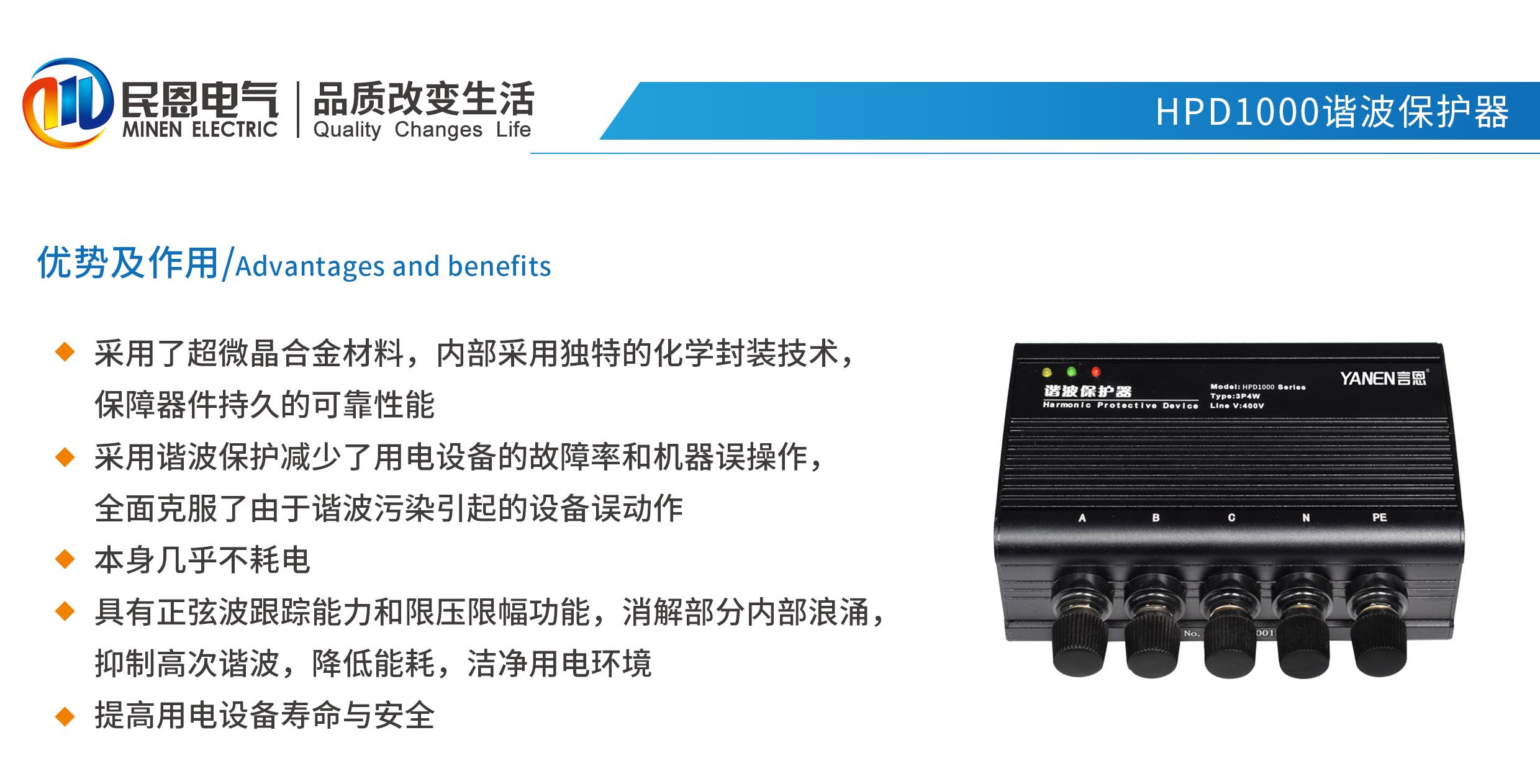 HPD1000諧波保護器本身幾平不耗電,具有正弦波跟蹤能力和限壓限幅功能,消解部分內部浪涌,抑制高次諧波,降低能耗,潔凈用電環境,提高用電設備壽命與安全。